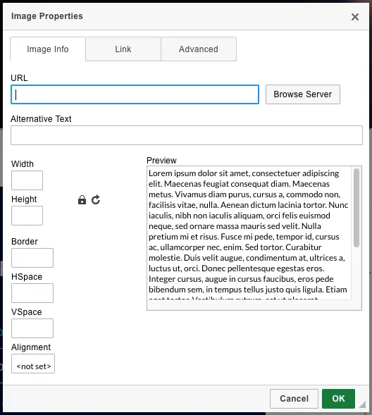 - Once selected, the Image Properties pop-up will appear. This will allow you to set the Alternative Text, Width and Height, H(orizontal)Space, V(ertical)Space, and Alignment